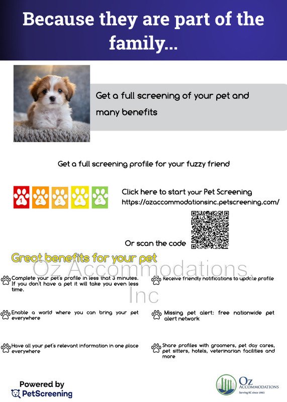 We use a third-party service, PetScreening, to ensure all applicants understand how to adhere to the property's pet and animal policies, even if you do not have a pet or animal. All applicants should complete a Pet, No Pet, or Animal Profile. Please use the QR code provided. Even if you do not currently have a pet, it is essential to fill out the form.
